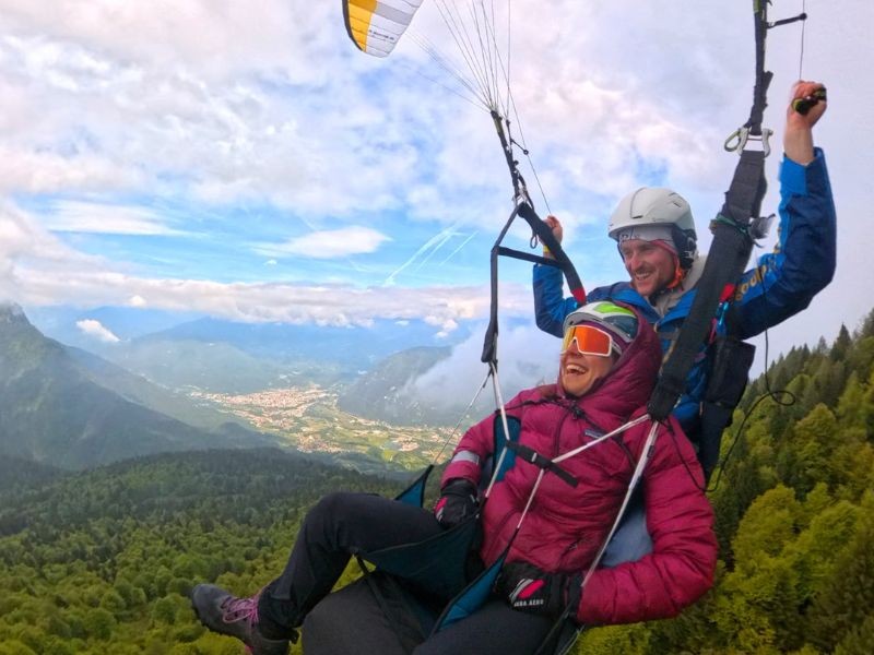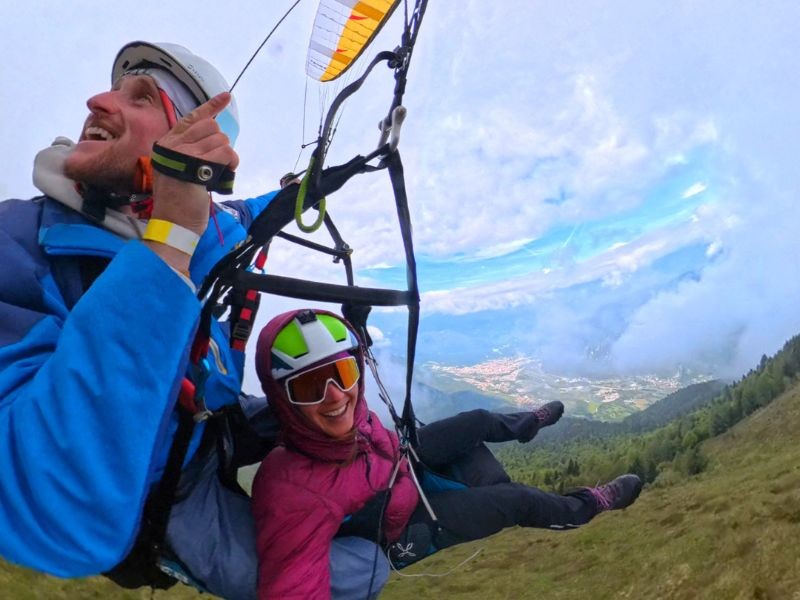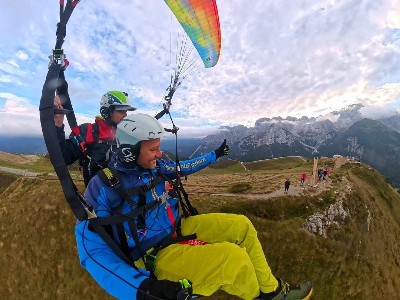 Poi arriva il momento più emozionante: il decollo. In un attimo ti ritrovi sospeso tra le cime delle Dolomiti, con il vento che accarezza il viso e la libertà di osservare dall’alto la Val Rendena, i boschi, le valli e i laghi alpini in un panorama unico e indimenticabile.
